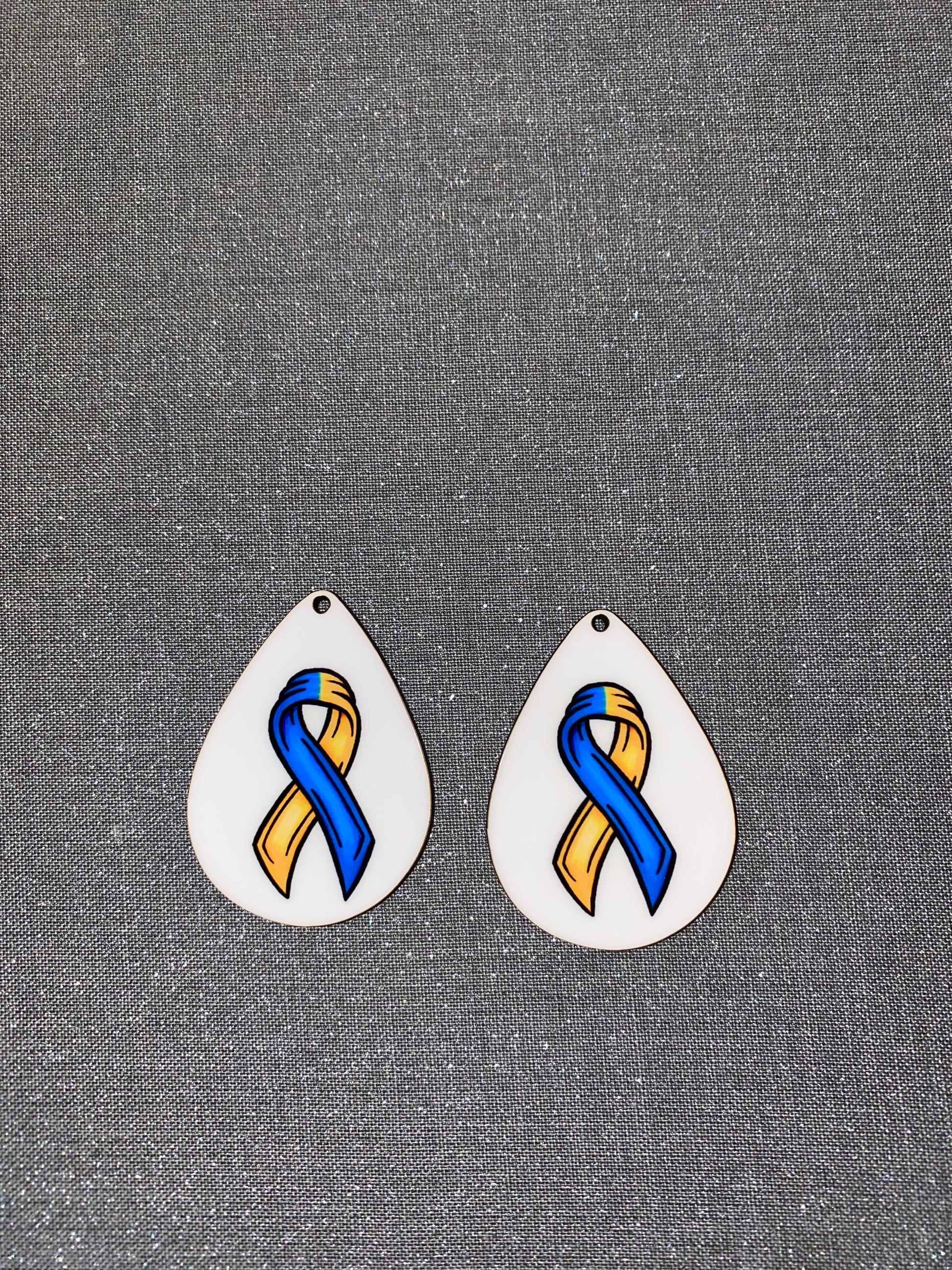 Down syndrome awareness/acceptance ribbon earrings. The teardrop is 1.5 inches tall and 1/3 inch thick. The design is one on the from side of the earrings and the back side has a wood look appearance. The earring have sterling 925 ear wires. Total earring length is approximately 2.5 inches.